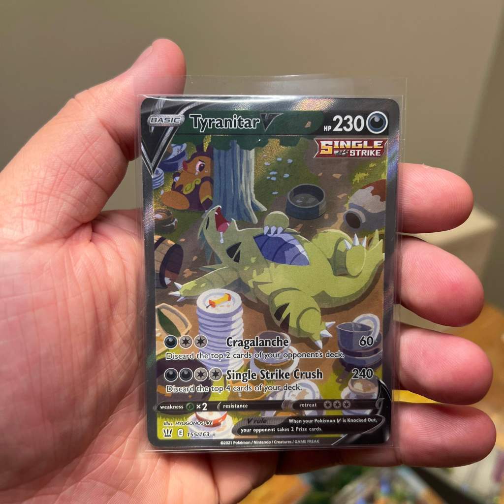 I personally watched a close friend and his significant other pull my chase card straight out of a Battle Styles ETB; Tyranitar V 155/163. This sleeping alternate full art from Battle Styles was a beauty. I consequently pulled a Single Strike Urshifu V 151/163 (alternate full art) & secret rare Houndoom 179/163 from my booster box.